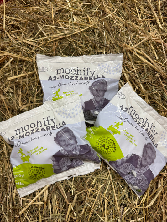 Unser A2 Mozzarella ist ein frischer, hochwertiger Käse, der durch seine zarte Textur und seinen milden Geschmack begeistert. Hergestellt aus sorgfältig ausgewählter A2-Milch, ist er besonders verträglich und eignet sich perfekt für alle, die auf eine schonende Ernährung Wert legen. Ob auf Pizza, im Salat oder als Snack – unser A2 Mozzarella verleiht deinen Gerichten eine cremige Konsistenz und einen authentischen Geschmack. Genieße die Qualität und Frische unseres A2 Mozzarella – eine köstliche Wahl für jeden Tag!